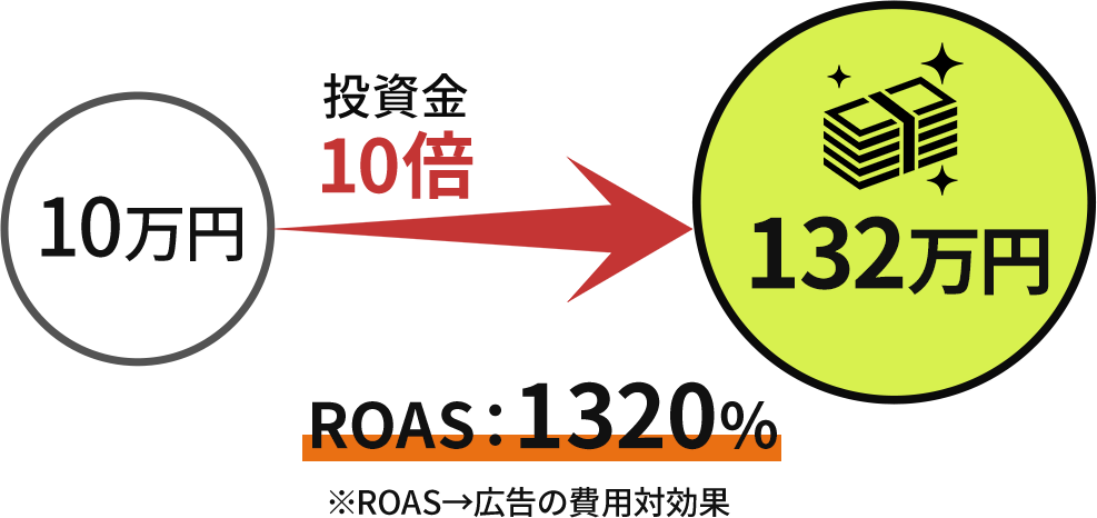 ビジネス用語を聞いたことがない人には、ピンとこないかもしれませんが、10万円の広告費をかけると、132万円の広告の費用対効果となるとしたら・・?